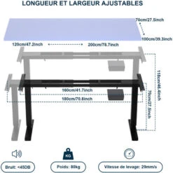 grande zone de réglage (hauteur + largeur): Une hauteur électrique illimitée de 71 cm à 116 cm peut être réglée. Il est très adapté au travail debout et adapté aux petites personnes ou aux enfants. La largeur réglable se situe entre 106 cm et 180 cm. Très durable. Stabilité et sécurité: les cadres en acier solides garantissent la stabilité horizontale maximale. Sécurité des enfants: L’affichage a une fonction de blocage, de sorte que le bureau n’augmente pas ou ne diminue pas de manière inattendue. Fonctions utiles: le cadre de bureau a des fonctions d’affichage numérique et de mémoire et peut enregistrer jusqu’à 4 hauteurs distinctes. De plus, les capteurs anti-collision et les dispositifs de sécurité des enfants ont été installés. Taille et technologie: ajustement élevé: de 71 cm à 116 cm. La largeur peut être définie: 106 cm à 180 cm. Taille de bureau recommandée: largeur de 120 cm à 200 cm, profondeur de 70 cm à 100 cm et la capacité de charge est de 120 kg. Acier en carbone roulé Taille du produit: 109x58x71,5-116,5 cm Taille d’emballage: 88,5×46 .2×17,5 cm Poids net: 18,31 kg MAO DIFFICILE: 20,6 kg Vitesse: 29 mm / s, Résistance à la réunion Noise: <50 dB Bevene: 120 kg