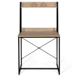 Descriptif du bureau étagère droit DETROIT design industrielFaites place au style industriel avec le bureau étagère droit DETROIT bi-matière en bois et métal. Ses lignes sobres et son style épuré donneront à votre intérieur un aspect loft du meilleur effet !Avec son coloris bois et ses matériaux bruts, votre bureau trouvera facilement sa place chez vous car vous pourrez l’intégrer à différents styles d’intérieurs en renforçant le côté loft ou en donnant un peu de chaleur à son design.Le bureau bois métal industriel est doté d’un plateau très pratique en particules de bois d’une longueur de 80 cm sur 48 cm de largeur. Il est optimal pour travailler confortablement, disposer vos pots à crayons, trier vos documents sans gêne et installer votre poste d’ordinateur sur l’espace de travail.Conçu tout en hauteur, ce bureau compact et gain de place s’intégrera aisément à une chambre ou un salon sans encombrer votre pièce !Fonctionnel, grâce à sa longue étagère en bois disposant de 3 niches vous pourrez facilement ranger vos fournitures de bureau, disposer vos objets de décoration favoris et laisser libre votre espace de travail sur le bureau !Le plateau de 1,5 cm d’épaisseur est soutenu par une structure métallique qui vous assure solidité et stabilité au quotidien. Laissez entrer le style industriel si tendance dans votre intérieur avec notre bureau bi-matière en métal et bois !Pratique et déco, ce meuble modernisera votre salon, chambre ou bureau et facilitera le rangement de votre espace de travail !Dimensions du bureau étagère droit DETROIT design industrielDimensions totales du bureau : Longueur 80 cm x largeur 48 cm x Hauteur 137 cmDimensions de l’étagère : Longueur 75 cm x Profondeur 12,5 cm x Hauteur 9,5 cmLongueur de chaque niche : 27 / 18 / 27 cmEspace entre le plateau et l’étagère : 51,5 cmHauteur rebord au fond du plateau : 6 cmHauteur plateau : 75 cmPlateaux en particules de bois : épaisseur 1,5 cmA associer par exemple avec nos chaises SARA noires.Découvrez également l’ensemble de nos bureaux ainsi que notre collection industrielle sur notre boutique en ligne !