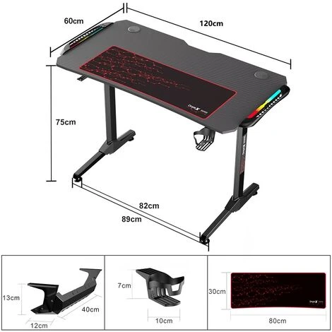 La table mesure 120 cm de long et peut accueillir jusqu’à trois moniteurs, un ordinateur portable, un clavier, un système de jeu de souris et tout ce dont vous avez besoin pour vous immerger dans le monde du jeu.
