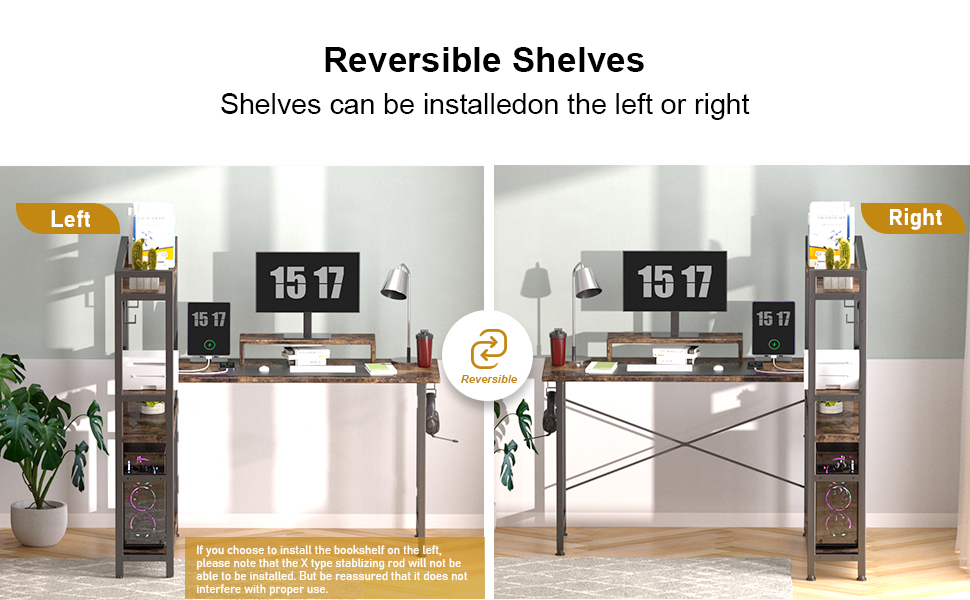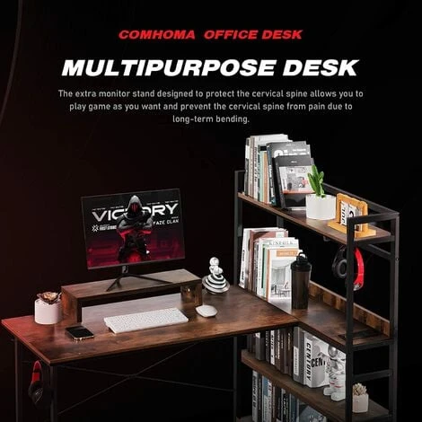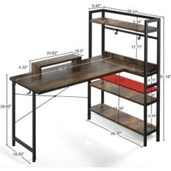 ăBureau spacieuxă Ce bureau d’ordinateur de 55 pouces dispose d’un poste de travail spacieux et d’Ă©tagĂšres de rangement latĂ©rales Ă 4 niveaux pour un grand espace de stockage. Vous pouvez placer librement des livres et des dĂ©corations. Les 4 crochets en fer supplĂ©mentaires vous aident Ă organiser facilement vos petites affaires.