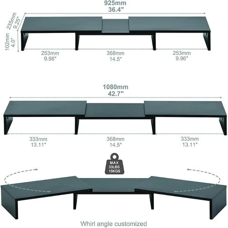 【Matériau de Haute Qualité】Dimension:92,5-108×23,5×10,2cm, capacité maximale: 25 kg.Ce moniteur stand en bois est fabriqué en panneau MDF mat de 12 mm, résistant aux rayures,ayant une longue durée de vie,très facile à nettoyer.