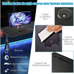 - Grand bureau : Le bureau de jeu dispose d’un plateau de table spacieux pour offrir un espace Ă©norme pour vos moniteurs, claviers et autres accessoires de jeu. Recouvert d’une texture en fibre de carbone de qualitĂ© supĂ©rieure, le bureau est impermĂ©able, rĂ©sistant aux rayures et doux pour la peau.