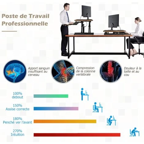 - Pratique Ă utiliser: Le poste de travail assis-debout est de hauteur rĂ©glable qui est un bon Ă©quipement ergonomique au bureau. Quand vous sentez des courbatures après avoir assis longtemps, Ă©levez le poste et continuez le travail en vous levant. Cela aidera Ă soulager les douleurs musculaires après longues heures assis devant l’ordinateur.