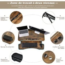 Est-ce que vous sentez la douleur après longues heures de travail devant l’ordinateur? Voulez-vous travailler dans une condition plus confortable? Achetez notre poste de travail assis-debout! Ce produit réglable en hauteur vous permet de travailler debout pour soulager la douleur musculaire. Avec une grande surface de 2 couche y compris un panneau amovible pour clavier, vous avez un espace de travail extra spacieuse. Sa bonne capacité de charge et sa structure stable vous donnent meilleure sensation d’usage. Ajoutez-le dans votre panier maintenant!