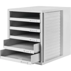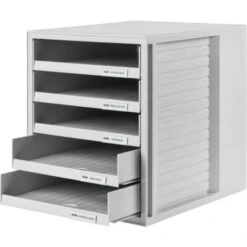 - Coffret à tiroirs avec 5 tiroirs ouverts avec clips d’inscription pour format de papier DIN A4 et plus grand
