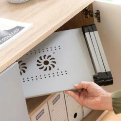 Sa base est en aluminium avec des perforations pour favoriser la ventilation et réduire la chaleur émise par l’ordinateur.