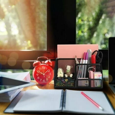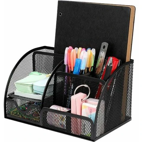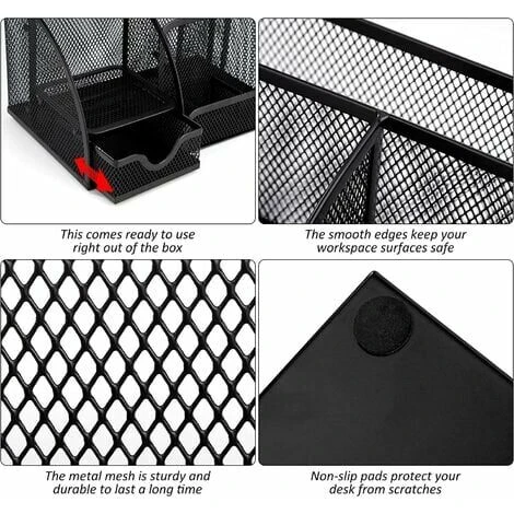 Gardez votre bureau bien rangé: Fatigué de chercher des fournitures de papeterie dans un bureau en désordre ? Non seulement cette boîte de rangement de bureau avec beaucoup espace de stockage peut vous aider à emballer la papeterie et les fournitures, mais elle peut également faciliter leur organisation pour un accès rapide !Étagère de bureau peu encombrante: étagère de bureau en maille a six compartiments et un tiroir coulissant pour le tri et le stockage. Il peut organiser vos stylos/crayons, télécommandes, téléphones portables, cartes, câbles USB, ordinateurs portables et de nombreux autres petits objets.Offrir de meilleures fournitures de bureau et décorations: La conception unique en treillis métallique et la finition noire élégante peuvent être facilement combinées avec autres fournitures de bureau pour donner à vos fournitures de bureau une touche moderne.La conception antidérapante sur le fond maintient appareil en place et évite parfaitement les rayures sur la table ou la table. La conception creuse globale reste ventilée et complètement sèche, et la boîte de rangement ne collecte pas la poussière aussi facilement.Robuste et durable: Fabriqué en matériau métallique solide et durable, difficile à craquer et à déformer, solide et durable. Le revêtement époxy noir respectueux de environnement est inodore et ne se décolore pas, ce qui prolonge efficacement la durée de vieFabriqué en tissu acier durable et résistant aux rayures avec des bords métalliques renforcés. Les tiroirs de nos boîtes de rangement de bureau coulissent facilement et peuvent être facilement retirés pour créer un espace de stockage extensible.Il y a 4 patins antidérapants sur le fond pour améliorer la stabilité et protéger votre bureau.Grâce à sa taille compacte, ce gestionnaire de bureau peut facilement être placé importe où.Le cadre grillagé vous permet de visualiser immédiatement le contenu de chaque compartiment.Vous pouvez protéger les bords métalliques arrondis des rayures.Le cadeau parfait pour les enfants, la famille, les amis ou les partenaires commerciaux.La livraison du produit comprend uniquement: 1 boîte de rangement noire Quantité expédition : une pièce