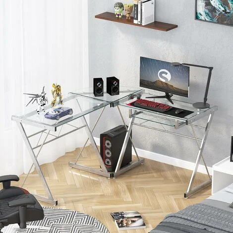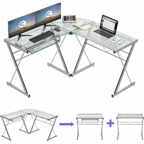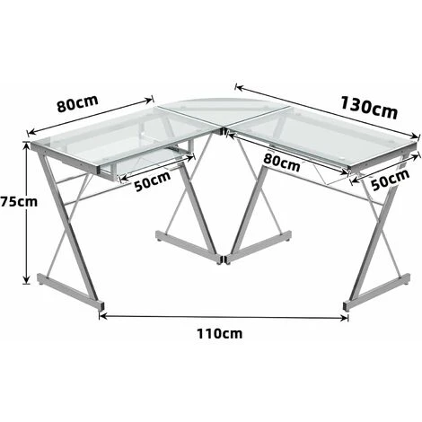 Matériaux de haute qualité.Le bureau est fait de verre transparent de haute qualité et d’un cadre en acier pour plus de stabilité et de durabilité, avec plateau pour clavier.La taille du bureau de 130 cm x 130 cm x 75 cm en forme de L offre un grand espace de travail à utiliser.Capacité de 2 à 3 moniteurs.
