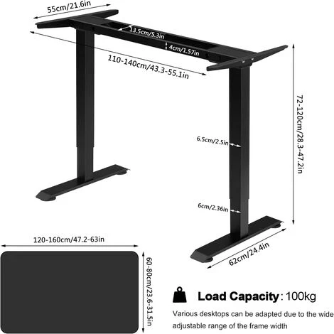 -La hauteur du cadre de bureau est réglable de 72 à 120 cm afin que vous puissiez travailler confortablement en position assise ou debout.